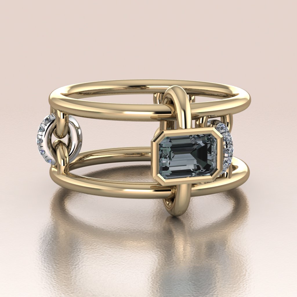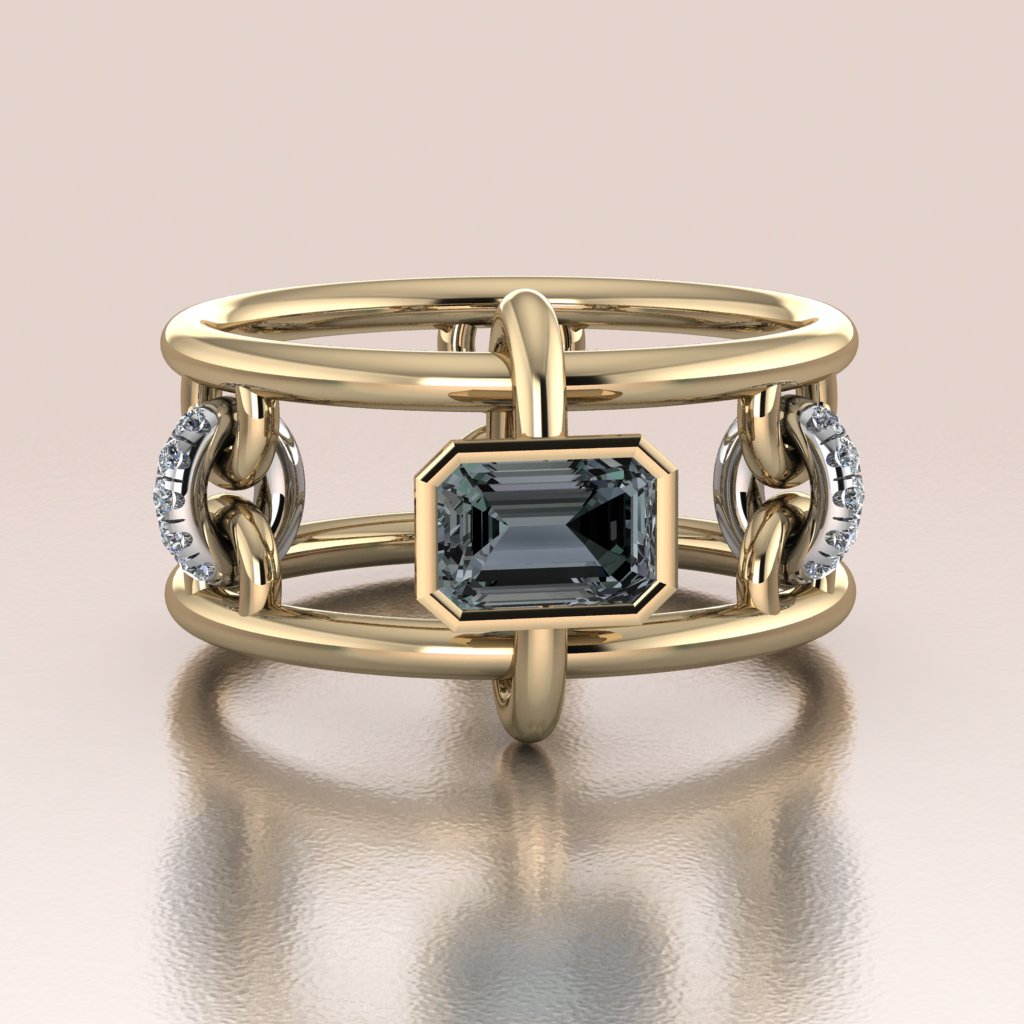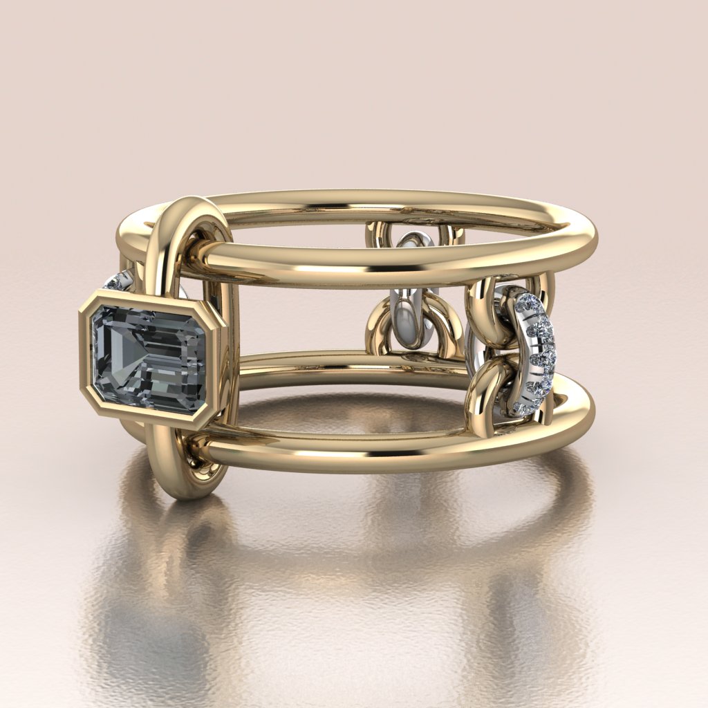 True to the Antoanetta philosophy, this ring is alive. The central emerald-cut stone is bezel-set on a floating gold link that glides freely along the parallel rails of the band. Flanking the center are articulated diamond-set chain links that do not sit static, but drape and shift with the movement of your hand. It is an architectural structure that feels soft, fluid, and mesmerizing to wear.