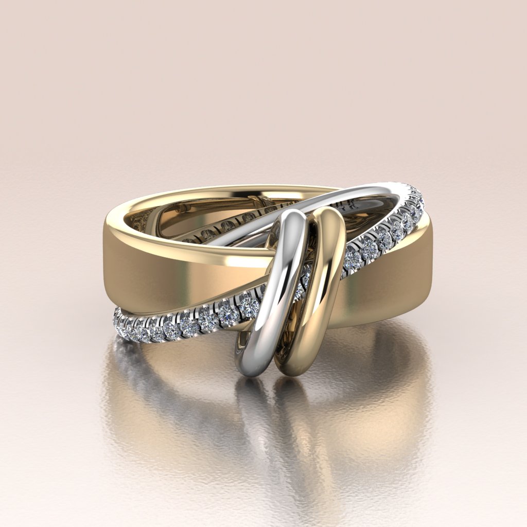 Crossing over this bold foundation is a delicate, high-polish 14k White Gold band paved with brilliant White Diamonds. The two distinct forms are not soldered shut but are held in place by two polished gold connectors, allowing them to bridge and flow over one another. It is an architectural embrace—strength and sparkle working in harmony.
